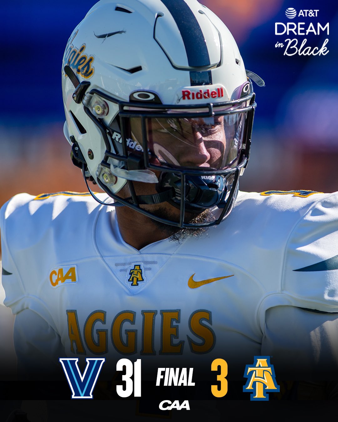 VILLANOVA, Pa. – North Carolina A&T crept past the 50-yard line five times in Saturday’s game against No. 12 ranked Villanova, yet only scored a single field goal in a 31-3 loss at Villanova Stadium. The Aggies passing game difficulties continued. A week after throwing for 90 yards, the Aggies threw for 50 on Saturday, dropping to 1-9 overall and 0-6 in the Coastal Athletic Association (CAA).  Meanwhile, the Wildcats rushed for 223 yards to improve to 8-2 overall and 5-1 in league play.